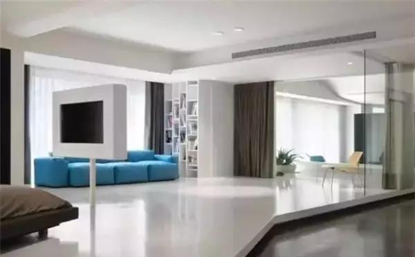 在客廳,一張素色的自流坪地面,搭配素面朝天的白墻、簡簡單單的一張軟沙發,隨便鋪一張地毯,剛柔并濟之美盡顯。